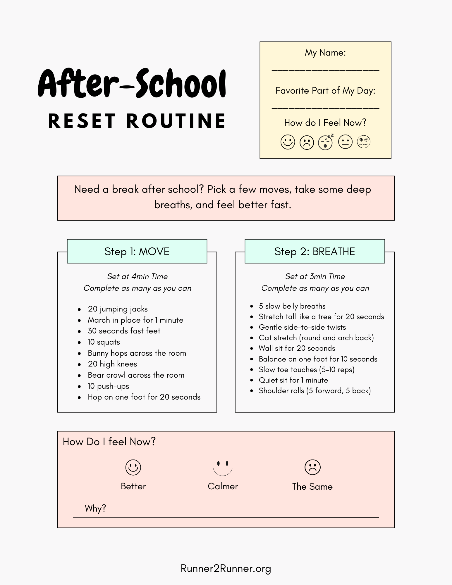 After-School Reset Routine Long school days require a lot of focus, patience, and self-control. When kids walk through the door with big energy or big emotions, this simple 10-minute reset helps them transition from school mode to home mode.This structured printable guides kids through:Step 1: Move (release built-up energy)Step 2: Breathe (slow the nervous system)A simple reflection section to build awarenessWith a built-in timer suggestion and easy-to-follow movements, this routine helps prevent after-school meltdowns and creates a smoother evening at home. Email Address Download Enjoy!